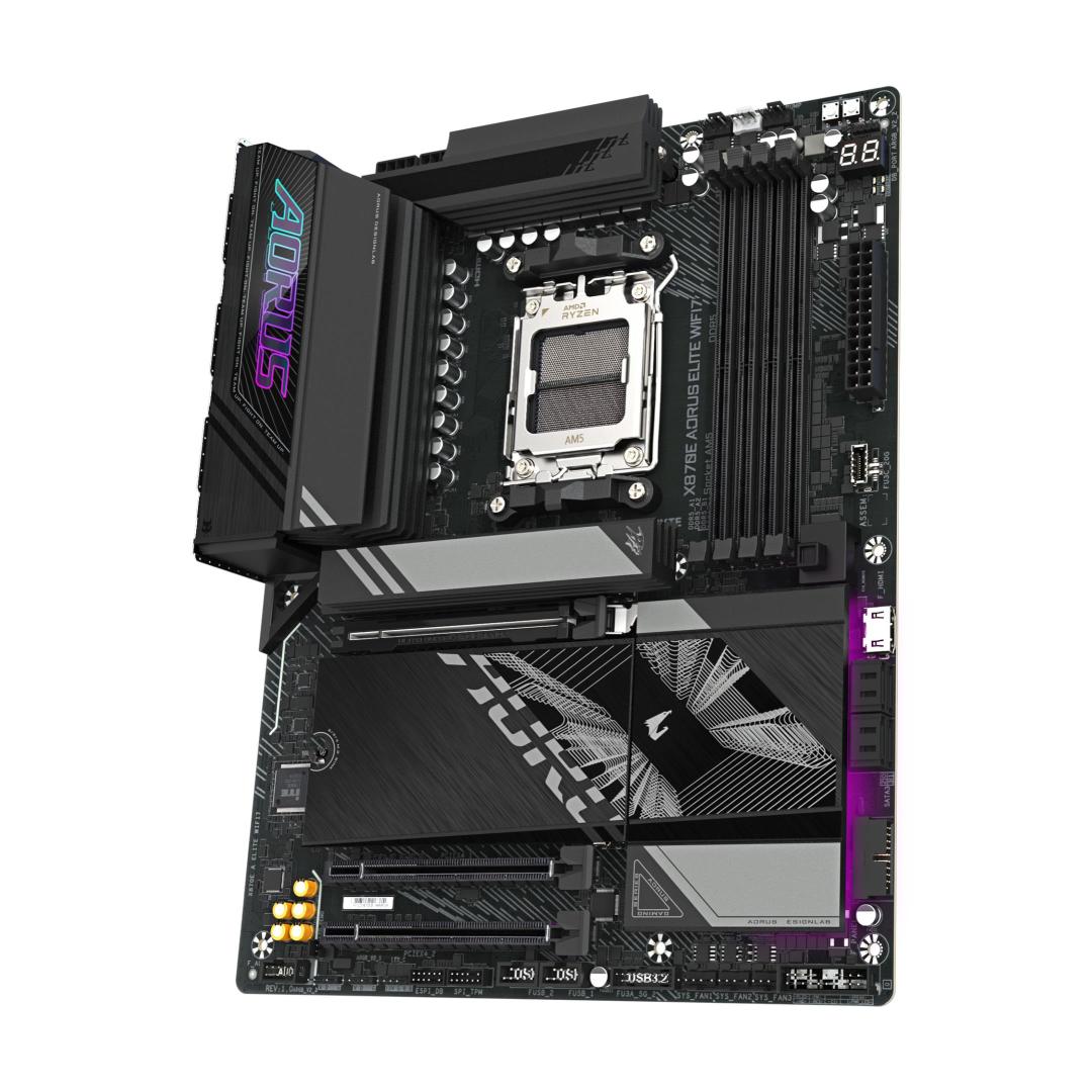 GIGABYTE X870E AORUS ELITE WIFI7 Motherboard - Supports AMD Ryzen 9000 CPUs, 16+2+2 Phases Digital VRM, up to 8000Hz DDR5 (OC), 3xPCIe 5.0 + 1xPCIe 4.0, Wi-Fi 7, 2.5GbE LAN, USB 4. Processor manufacturer: AMD, Processor socket: Socket AM5, Compatible processor series: AMD Ryzen 7000 Series, AMD Ryzen 8000 Series, AMD Ryzen 9000 Series. Supported memory types: DDR5-SDRAM, Maximum internal memory: 256 GB, Memory slots type: DIMM. Supported storage drive interfaces: M.2, SATA III, Supported storage drive types: HDD & SSD, RAID levels: 0, 1, 10. Ethernet interface type: 2.5 Gigabit Ethernet, LAN controller: Realtek RTL8125, Top Wi-Fi standard: Wi-Fi 7 (802.11be). Component for: PC, Motherboard form factor: ATX, Motherboard chipset family: AMD