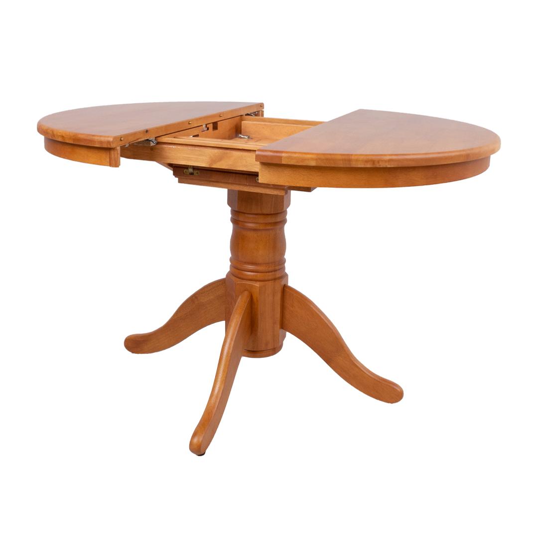 Pöytä on ulosvedettävä. Pöytälevy aukeaa keskeltä ja jatkopala asetetaan kahden sivun väliin.
