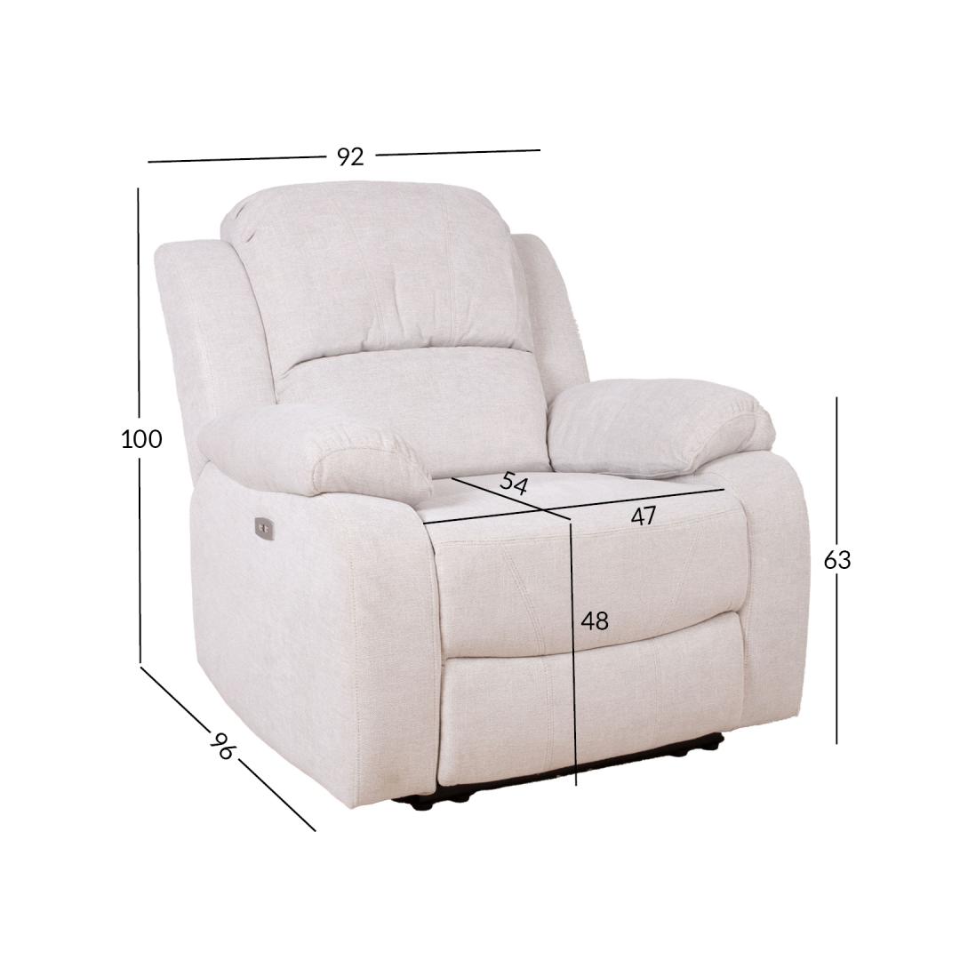 Nojatuolin kokonaismitat: 92x96xK100cm. Istuimen leveys 47cm, istuimen syvyys 54cm, istuimen korkeus 48cm. Käsinojan korkeus maasta 63cm. Nojatuoli FELICIA sähköinen lepotuoli, luonnonvalkoinen.