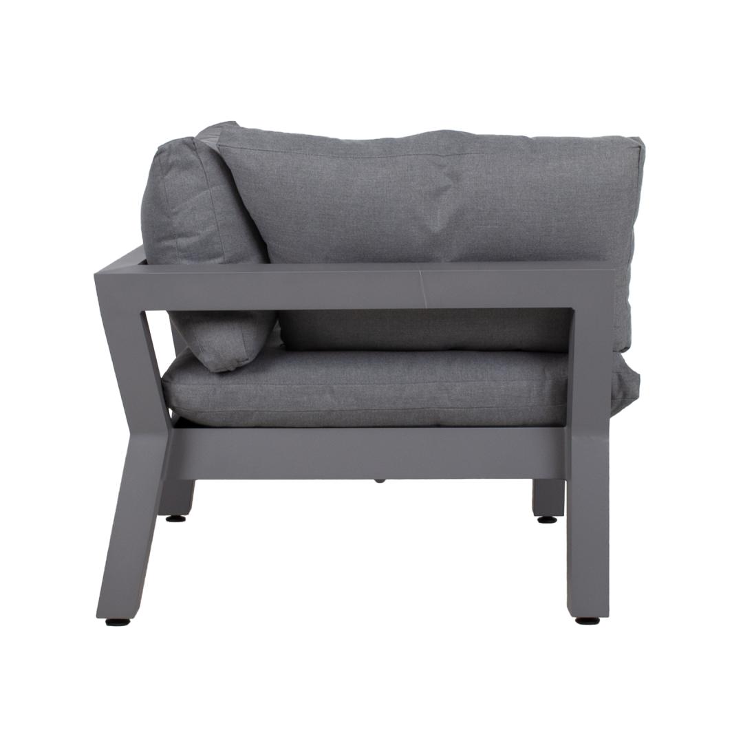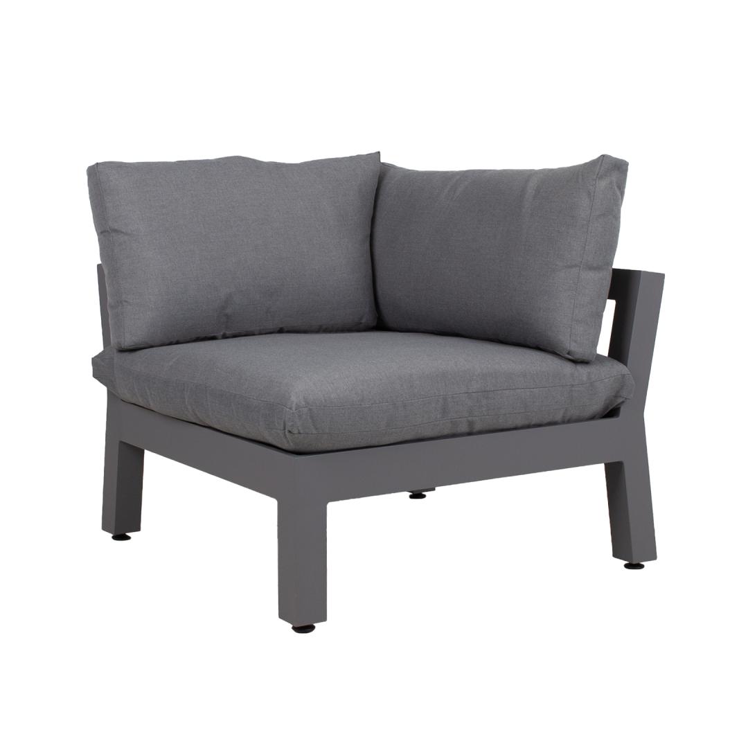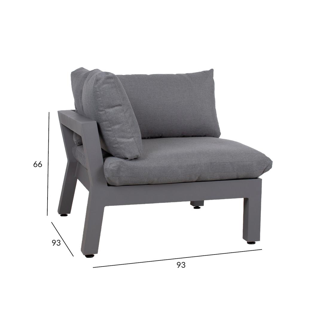 Kulmasohva FLUFFY 93x93xH66cm, harmaa. Modulaarinen sohva on loistava tapa luoda oikean muotoinen ja kokoinen oleskelualue, jota on helppo muuttaa ja järjestää uudelleen. Sohvan runko on valmistettu alumiinista ja viimeistelty harmaaksi pulverimaalattuna. Istuinjalustassa on leveät punotut hihnat, jotka on päällystetty 3 cm:n poroloonimatolla. Paksut ja pehmeät tyynyt ja joustava istuinpohja takaavat erinomaisen istumismukavuuden. Istuinkorkeus rungon reunaan on 35cm, 51cm tyynyn kanssa. Istuintyynyn mitat 87x87xH16cm, selkätyynyjen mitat 87x43x18cm, 72x43x16cm. Tyynynpäälliset ovat harmaata polyesterikangasta. Tyynynpäälliset ovat irrotettavia ja pestäviä. Tuote kestää hyvin vaihtelevia sääolosuhteita ja on helppo huoltaa. Ainoastaan tyynyt tarvitsevat suojaa säältä. Tyynynpäällinen on hyvä ratkaisu patjojen päivittäiseen säilytykseen ja kuivana pitämiseen. Ulkokalusteiden käyttöiän pidentämiseksi suosittelemme ulkokalustesuojien käyttöä. HUOLTO: Kesäkauden päätyttyä suosittelemme puutarhakalusteiden säilyttämistä sisätiloissa. Kesäkauden päätyttyä suosittelemme jättämään huonekalut puutarhaan talvikuukausiksi. Käytä säilytykseen kuivaa ja hyvin ilmastoitua tilaa.