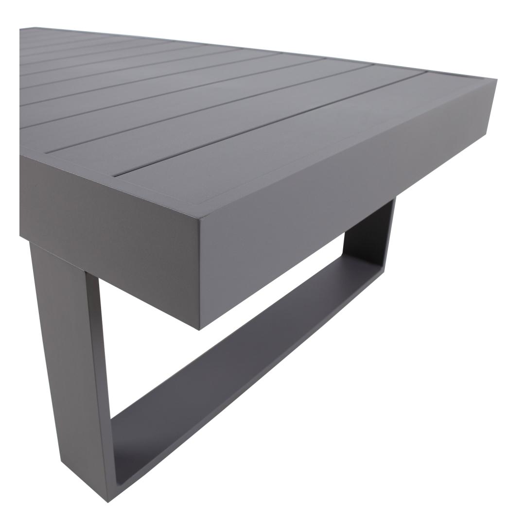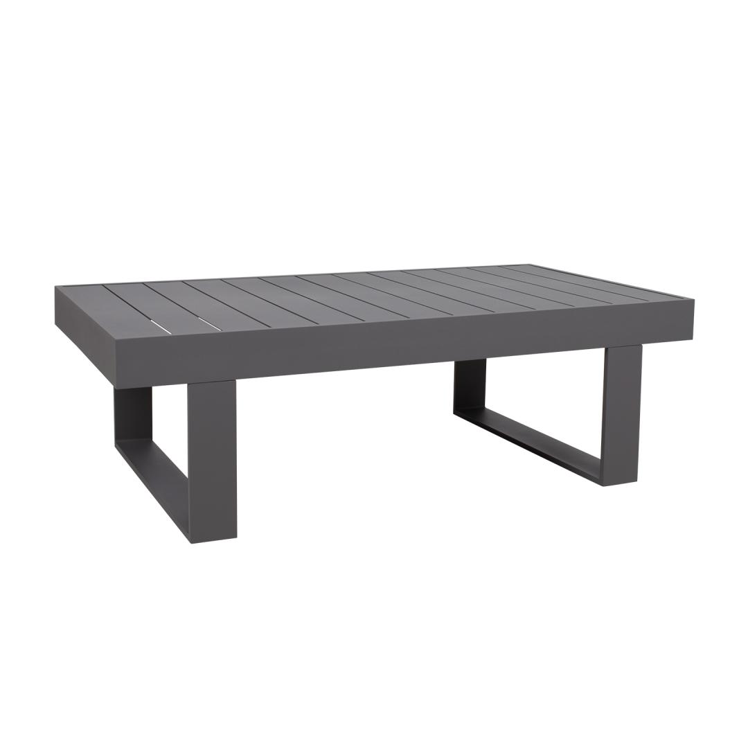 Sohvapöytä FLUFFY 133x73,5xH42cm, harmaa. Pöytälevy ja runko alumiinia ja viimeistelty harmaalla pulverimaalilla. Tuote kestää hyvin vaihtelevia sääolosuhteita ja on helppo huoltaa.