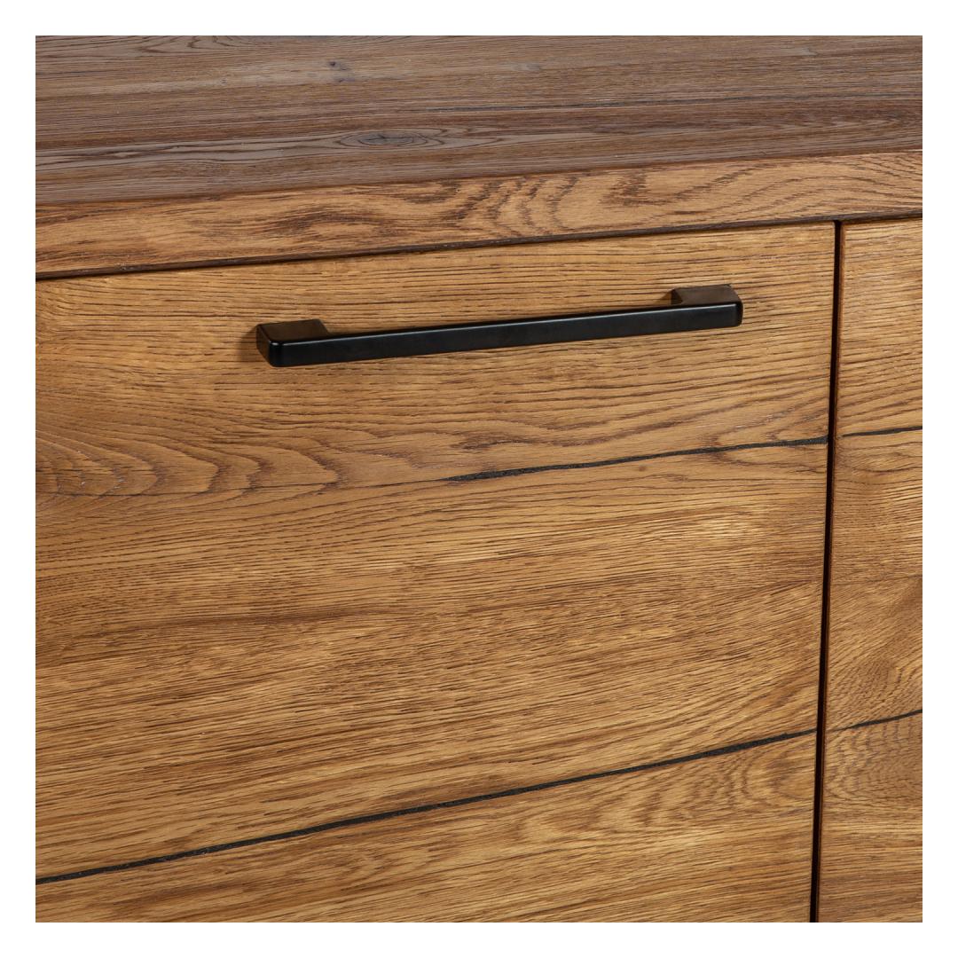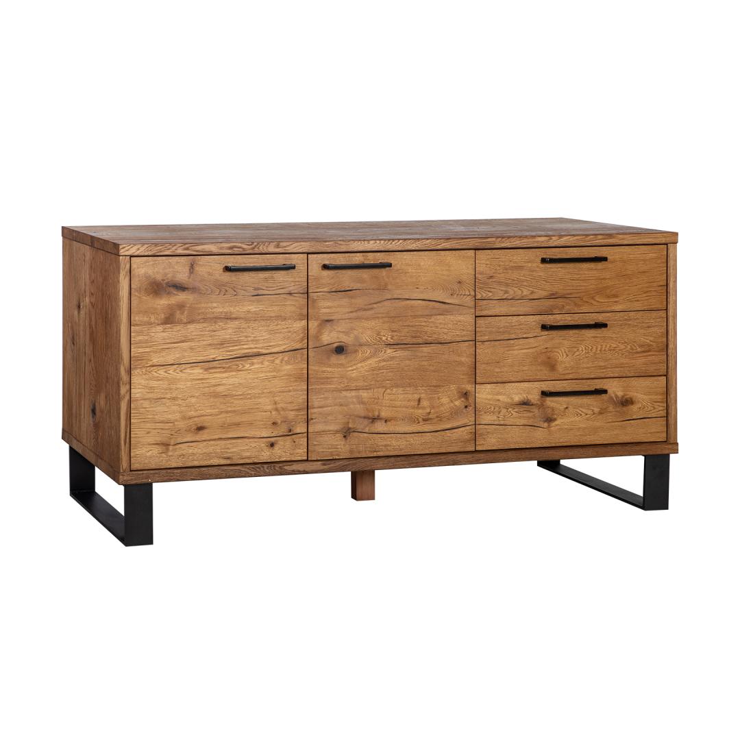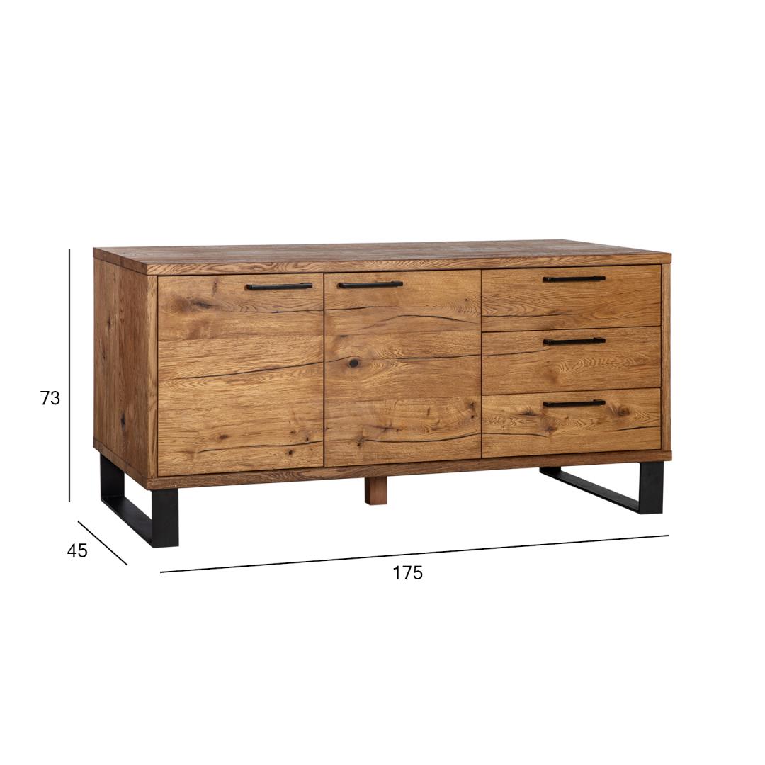 Lipasto ROTTERDAM, 3 laatikkoa ja 2 ovea 175x45xH73cm, tammi. Ulkorunko, ovet ja laatikoiden etulevyt on valmistettu huonekalulevystä ja päällystetty luonnollisella rustiikkitammiviilulla. Rustiikkiviilun rakenne on kirjava ja elävä. Suuret oksat, rapatut raot ja laaja sävyvaihtelu ovat sallittuja. Sieni viimeistellään öljyllä. Laatikot liukuvat puukiskoilla. Kaksipuolisen kaapin kummankin oven takana on yksi hylly. Kaapin pohjakehys on valmistettu metallista ja viimeistelty mustalla pulverimaalilla. Jalkojen korkeus 15cm.