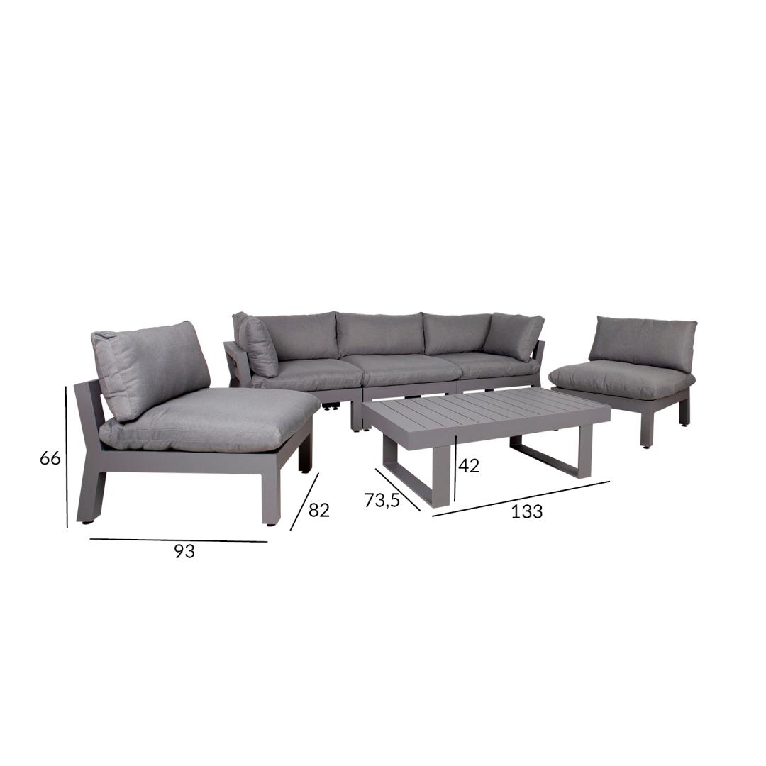 Garden furniture set FLUFFY modular sofa and table. The set includes 2 corner modules, 3 intermediate modules and a sofa table. It is easy to change the layout and order of the modules. The frames of the sofa modules and the table are made of aluminum and finished with gray powder paint. The dimensions of the table are 133x73.5xH42cm. The dimensions of the knife module are 93x93xH66cm, the dimensions of the intermediate module are 82x93xH66cm. At the bottom of the seat modules there are wide braided straps, which are covered by a 3cm foam mat. Thick and soft cushions and an elastic seat base ensure excellent sitting comfort. The height of the seat to the edge of the frame is 35 cm, including the pillow 51 cm. The dimensions of the seat cushions are 87x87xH16cm, the dimensions of the back cushions are 87x43x18cm, 72x43x16cm. The cushion covers are made of gray polyester fabric. The pillow covers are removable and washable. The product is very durable in changing weather conditions and easy to maintain. Only cushions need protection from the weather. A good solution for daily storage of pillows and keeping them dry is a pillow case. To extend the life of outdoor furniture, we recommend using outdoor furniture covers. STORAGE: At the end of the summer season, we recommend storing the garden furniture indoors. Clean and dry the furniture before storing. Use a dry and well-ventilated room for storage. Aiamööblikomplekt FLUFFY mooduldiivan ja laud. Komplekti kuulub 2 nurgamoodulit, 3 vahemoodulit ja diivanilaud. Moodulite paigutust ja järjekorda on lihtne muuta. Diivani moodulite raamid ja laud on valmistatud alumiiniumist ja viimistletud halli pulbervärviga. Laua mõõdud on 133x73,5xH42cm. Nugamooduli mõõdud on 93x93xH66cm, vahemooduli mõõdud on 82x93xH66cm. Istmemoodulite põhjas on laiad põimitud rihmad, mida katab 3cm poroloonmatt. Paksud ja pehmed padjad ning elastne istmepõhi tagavad suurepärase istumismugavuse. Istme kõrgus raami ääreni on 35cm, koos padjaga 51cm. Istmepatjade mõõdud on 87x87xH16cm, seljatoepatjade mõõdud on 87x43x18cm, 72x43x16cm. Padjakatted on valmistatud hallist polüesterkangast. Padjakatted on eemaldatavad ja pestavad. Toode on muutlikes ilmastikutingimustes hästi vastupidav ja lihtsalt hooldatav. Kaitset ilmastikuolude eest vajavad ainult padjad. Hea lahendus patjade igapäevaseks hoiustamiseks ja kuivana hoidmiseks on padjakast. Välitingimustes kasutatava mööbli eluea pikendamiseks soovitame kasutada välimööbli katteid. HOIUSTAMINE: suvehooaja lõppedes soovitame aiamööblit hoiustada siseruumides. Puhastage ja kuivatage mööbel enne hoiule panekut. Kasutage hoiustamiseks kuiva ning hea ventilatsiooniga ruumi.