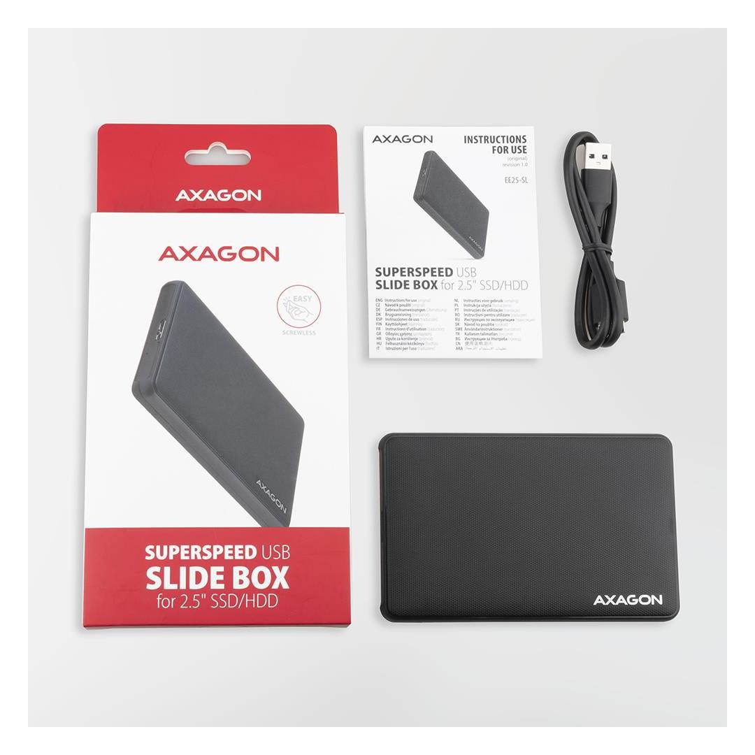 Kevyt ruuviton ulkoinen laatikko AXAGON EE25-SL SLIDE BOX, jossa on USB 3.2 Gen 1 (USB 3.0) ja SATA 6G -liitäntä, on suunniteltu kaikille 2.5" SATA-kiintolevyille tai SSD-asemille.