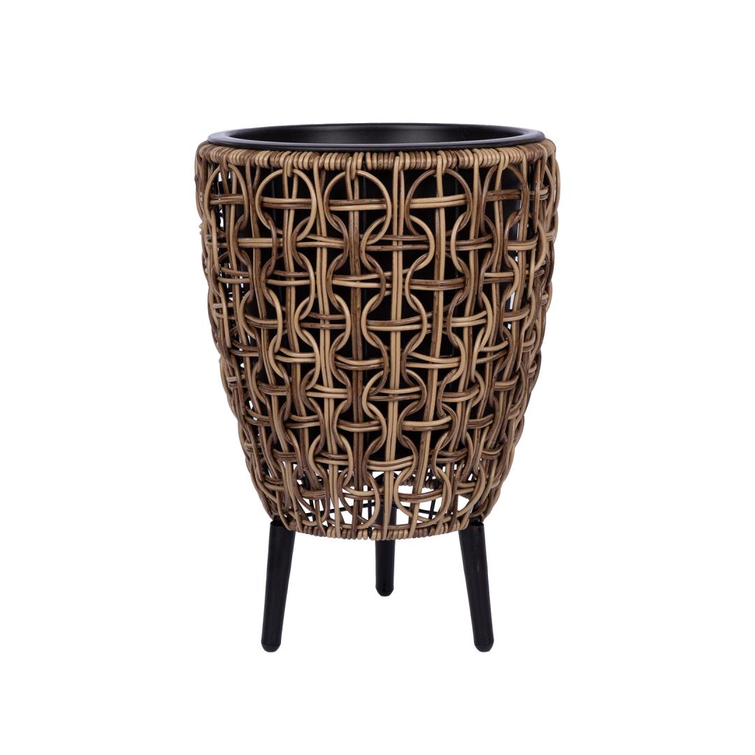 The metal frame of the flowerpot is covered with plastic wicker.