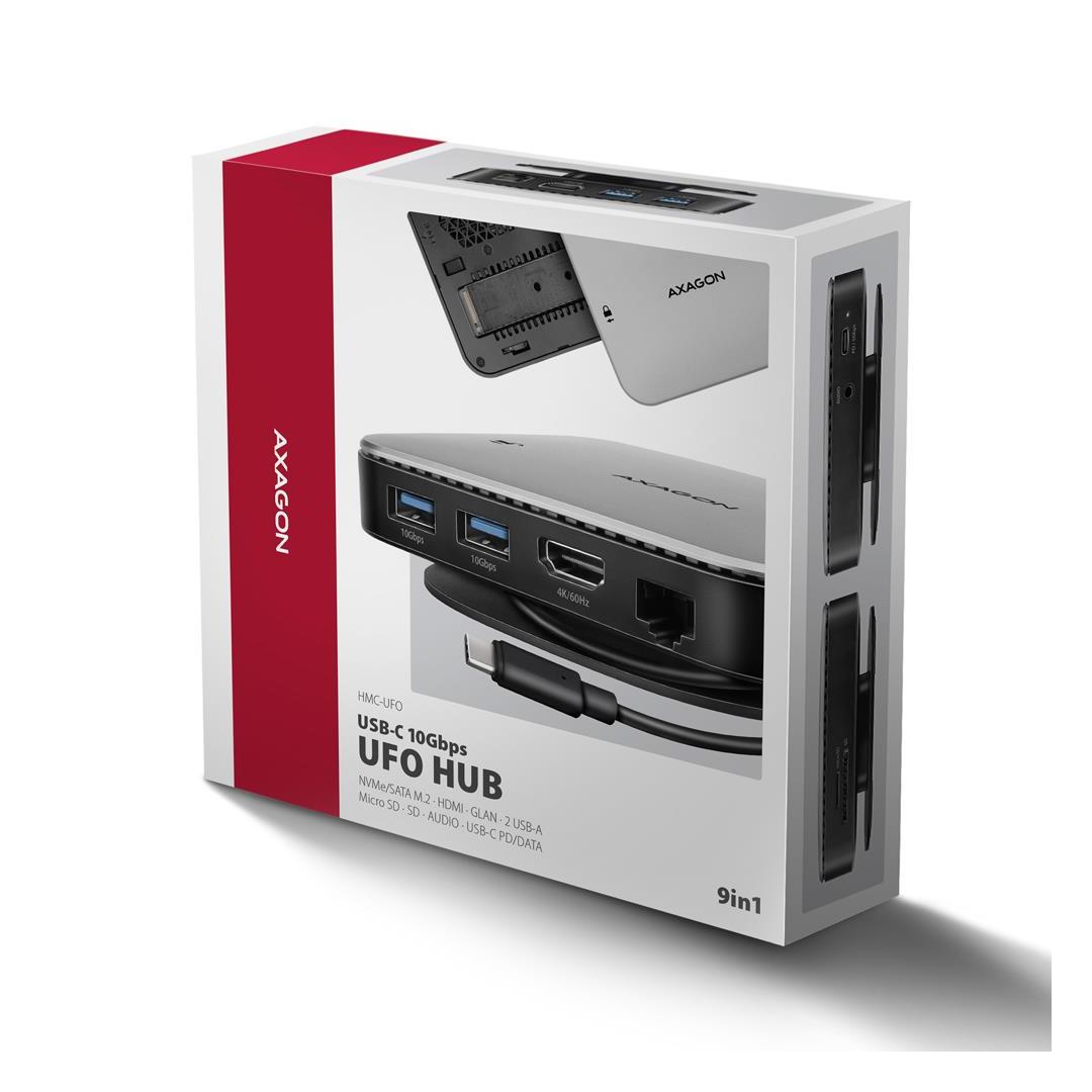 AXAGON HMC-UFO USB-C 10Gbps UFO-keskitin laajentaa kannettavaa tietokonettasi, tietokonettasi tai tablettiasi kahdeksalla portilla ja ulkoisella laatikolla M.2-asemalle. Yhdistät kannettavan tietokoneen 9in1-telakointiasemaan mukana toimitetulla 65 cm:n pituisella USB-C-kaapelilla. Hetkessä käytössäsi on integroitu paikka NVMe- tai SATA M.2 -asemalle, SD- ja microSD-kortinlukija sekä liittimet näytön, USB-laitteiden, kuulokkeiden, verkkokaapelin ja Power Delivery -virran kytkemistä varten. Thunderbolt 3/4 -yhteensopivuuden ansiosta saat myös yksinkertaisen ja kompaktin telakointiaseman kannettavalle tietokoneelle, kuten Applen MacBook Airille tai Prolle.