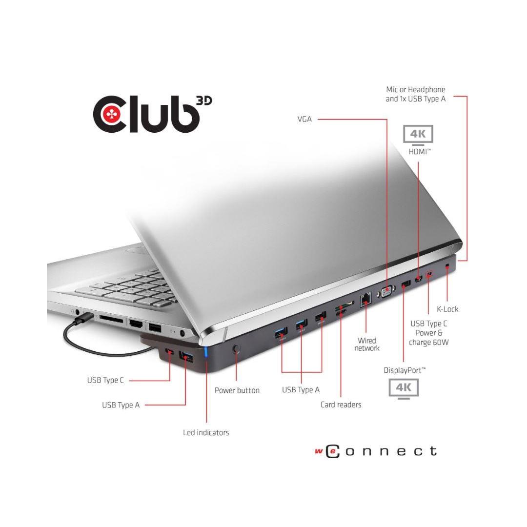 CSV-1564W100 - Club-3D USB 3.2 Gen1 C Triple Display Dynamic PD Charging Dock on integroitu ratkaisu, jossa yhdistyvät video-, data-, virta-, Ethernet- ja ääniyhteydet erityisesti paljon matkustaville. Kolmen eri videoportin (HDMI™, DisplayPort™, VGA) avulla voit nauttia kolmesta eri kuvasta tai videosta kolmella eri näytöllä samanaikaisesti MST-tilassa. USB Type A -porttien ja USB Type C -dataportin avulla voit liittää useita USB-laitteita isäntään. USB Type C -latausportin avulla voit antaa virtaa tälle telakalle ja ladata isäntätietokonetta samanaikaisesti liittämällä PD-virtalähteen, jolloin sinun ei tarvitse kantaa mukana kannettavan tietokoneen virtalähdettä.